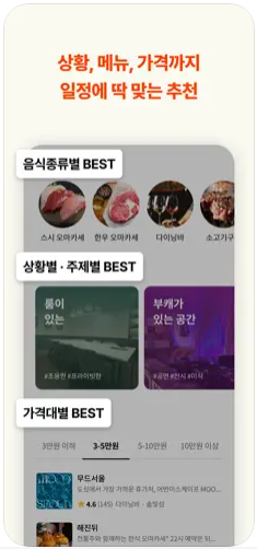 ■ 다양한 필터로 내 기호에 맞는 맛집 추천 방문 목적에 따라 날짜, 인원은 물론 가격대, 음식 종류, 테이블 타입까지 다양한 조건으로 맞춤형 추천 맛집을 찾을 수 있습니다. 데이트, 혼밥, 가족 회식 등 상황에 맞는 추천 맛집이 제공됩니다.