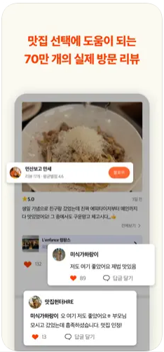 ■ 70만 개 이상의 리뷰로 맛집 선택을 도와드립니다. 다양한 음식점을 실제로 방문한 사용자들의 생생한 리뷰를 확인하고, 취향이 맞는 사용자를 팔로우하세요. 이를 통해 마음에 드는 맛집을 더 쉽게 찾을 수 있습니다.