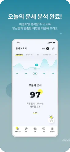 - ‘운세 보고서’로 하루를 계획해보세요!오늘의 운세, 시간대별 운세, 바이오리듬, 애정운, 금전운, 건강운 등을 한 페이지로 깔끔하게 확인할 수 있습니다. 행운의 아이템과 스타일을 완성해 줄 행운의 코디로 하루를 멋지게 시작하세요.
