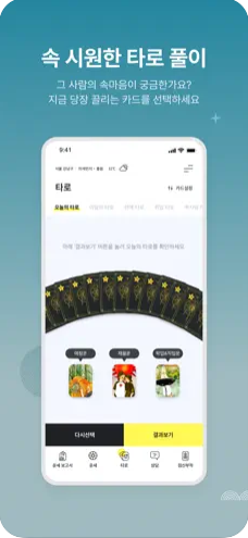 - 무의식까지 꿰뚫어보는 타로카드셀프 타로, 이렇게 정확할 수 있을까요? 간편한 터치로 당신의 애정운, 재물운, 학업운, 직업운까지 확인하세요. 운명의 방향을 타로카드로 찾아보세요.