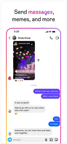 - Messenger를 활용하여 친구들에게 메시지를 보내보세요. 피드와 스토리에서 본 콘텐츠를 중심으로 대화를 나누고 공유해보세요.