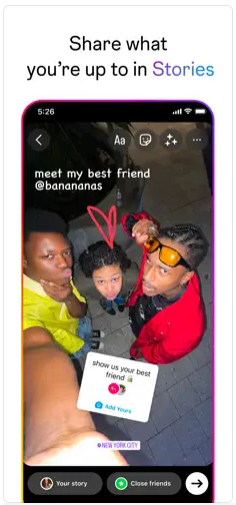 - 스토리에는 24시간 후에 사라지는 사진과 동영상을 업로드하며, 재미있는 크리에이티브 도구로 스토리를 더 생동감 있게 만들어보세요.