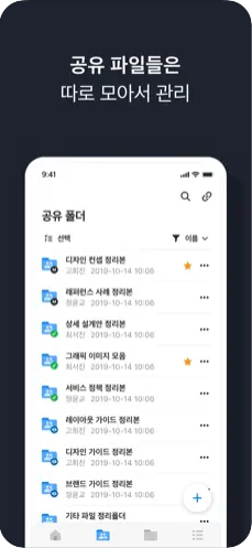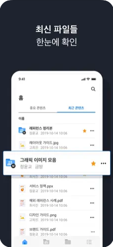 중요한 파일은 WORKBOX 서비스의 첫 화면에서 바로 확인할 수 있으며, 공유한 폴더나 파일의 위치를 쉽게 찾을 수 있도록 눈에 띄는 직관적인 화면 UI를 제공합니다.